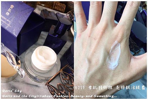 是說最早我也買過雪肌精眼霜,藍色那瓶,當時也寫過 KOSE 雪肌精眼霜 基本上,就是一瓶容量大,CP值高的眼霜,是有點沒那麼好吸收,所以你的量不能多,我只是驚喜它從我09年到現在,還一直都健在著!基本上,如果你眼部肌膚沒啥問題,就只是想要單純保濕,然後希望能更明亮的話,本來的雪肌精眼霜就很夠了,而且一罐20g,用量又很省,根本能用整整一年都還用不完; KOSE雪肌精御雅 亮眸賦活眼霜則是更強調更好吸收、也更滲透,保濕同時明亮外,多一點緊的訴求,搭配它獨特的雙螺旋頭按摩棒,一邊較細緻的平坦處能幫助KOSE雪肌精御雅 亮眸賦活眼霜吸收,另一編螺旋立體端,則是做滾動式的眼周按摩循環,藉以達到更吸收、更滲透,同時提拉的效果。