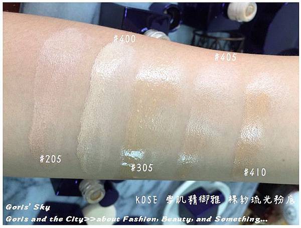 共5色,我由左至右,依淺至深都做好試色了,沒錯 ...你看到一定會想,這 也 太 清 透 了!沒錯,與其說KOSE雪肌精御雅 裸紗琉光粉底是粉底液,倒不如更像是粉底精萃、粉底精華,因為它的成分中,都是以植物精華油來取代的,還記得前面那KOSE雪肌精御雅 光能醒膚油精粹吧,你可以說是這KOSE雪肌精御雅 裸紗琉光粉底完全是該光能醒膚油精粹的粉底版,因為主要的構成就是薏仁油、茶籽油以及米胚芽油等 ...,所以擦起來就是一種輕油感,同時能夠讓肌膚比較膨潤、柔嫩,甚至是散發透明感的妝感,但同樣的,修飾力就沒那麼強,其實類似GIORGIO ARMANI的極緞絲柔粉底精華同是,所以我要說的是,在這KOSE雪肌精御雅 裸紗琉光粉底之前,如過你比較暗沈、肌膚比較不平整,就一定要靠妝前乳去好好打底、修飾。