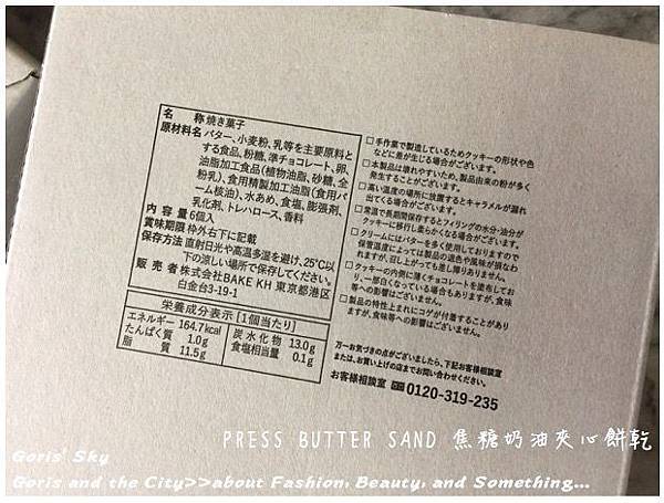 PRESS BUTTER SAND焦糖奶油夾心餅乾相關成分如上,基本上它外層像是但塔的塔皮,內層有奶油和焦糖醬,然後期限很不長,所以買了後要速速吃掉,大概兩週左右而已。