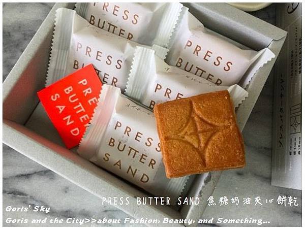 也因為它就是都是PRESS BUTTER SAND焦糖奶油夾心餅乾,每一個都是一樣的圖騰,同時如其標示的長寬高都是一定的45mmX45mmX20mm,極其對稱、整齊,同時簡約大方的設計,單是從外包裝、提袋、然後到產品本身就相當工整,工整到你都會覺得有些不可思議。