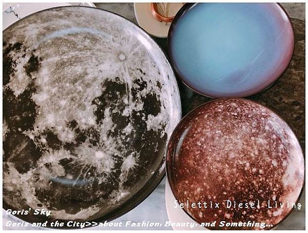 這是義大利品牌 Diesel 將設計延伸到居家的同時與 Seletti 的玩味設計聯名,以陶瓷、釉下彩的設計,製作成這樣一系列的宛如靜謐星空行星、太空餐盤,但我後來嘗試用這些餐盤拍美妝品不是那麼協調,因為真的有些太搶鏡,但如果只是單純作為菜色擺盤,甚至是餐桌上單的餐盤、擺盤,確實就蠻搭、蠻酷的,只是如果要用來襯底去當配角就比較難一點,因為這Seletti x Diesel Living 太空餐盤搶眼的都像主角一樣。