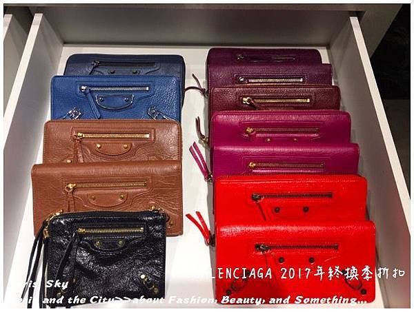 這次BALENCIAGA同樣也都是6-7折不等,包括經典的Classic city也都有,這個大小很適合大部分的女孩子,手提、勾著,甚至是背帶上肩都很適合,折扣下來大概就是五萬元左右了,紅極一時的Bazar Bag也在這一次的折扣行列之中,同時也是主要的重點,多種顏色、款式、設計都有,折扣後平均落在36000-43000之間,有興趣的也可以參考;經典的長夾也沒有少,顏色以紅色、大紅色、紫色、焦糖色、藍色等為主 ...,如果剛好想換個皮夾的話,又是你所喜歡的顏色ㄝ也可以趁這次折扣入手。