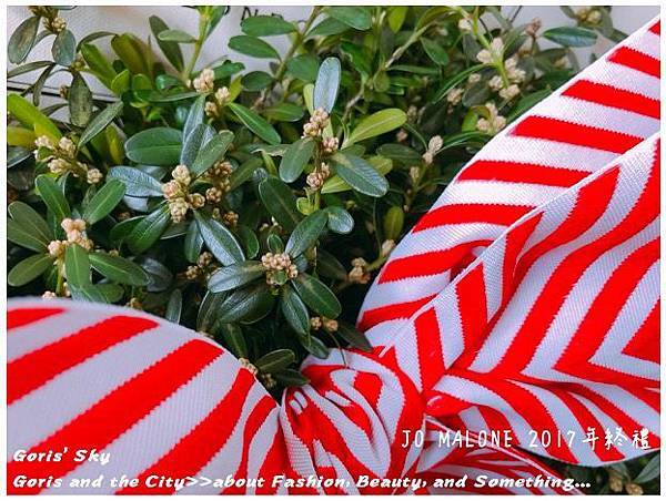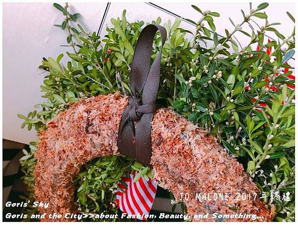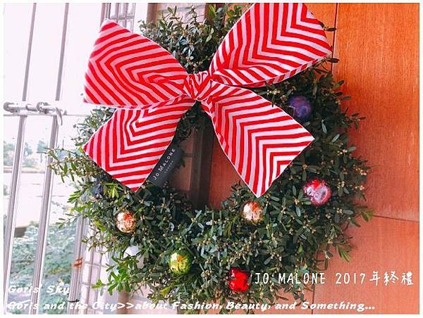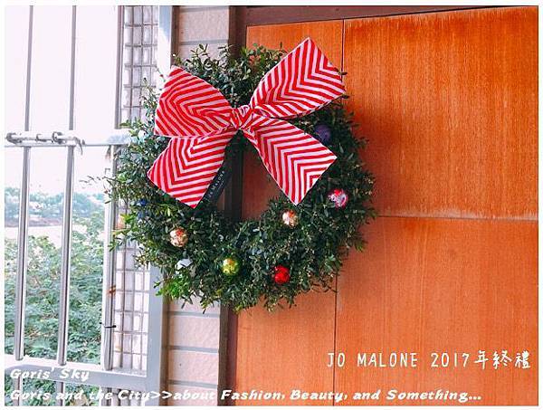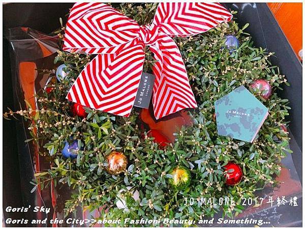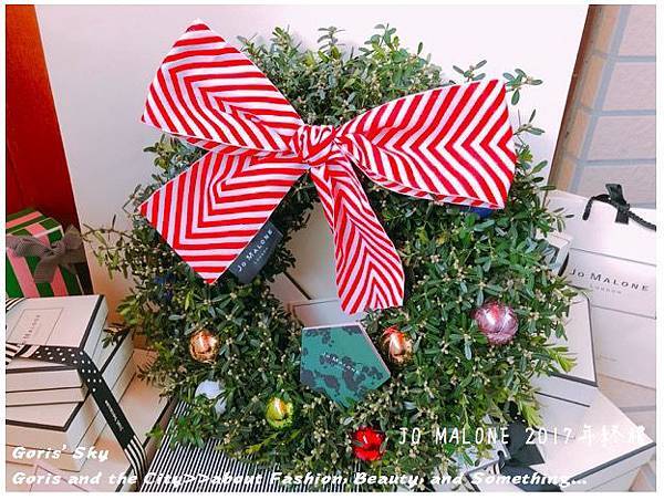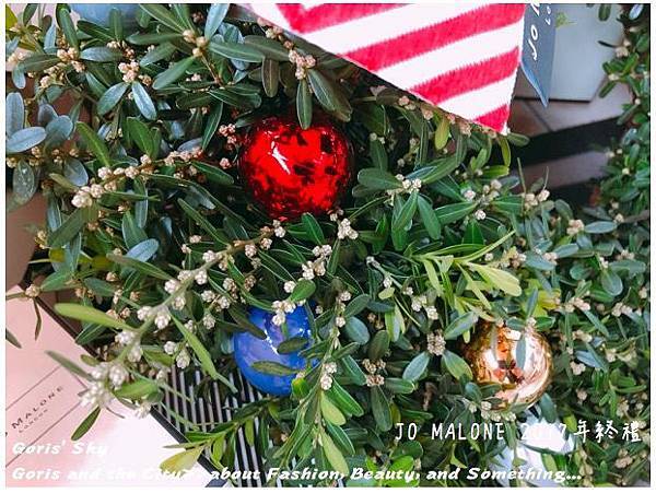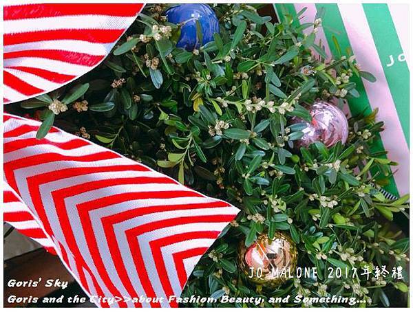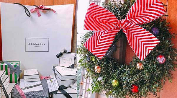 除了整圈環繞的而成聖誕花圈的槲寄生外,上面有著裝飾用的聖誕彩球,當然你也可以自己別上你自己想要的聖誕裝飾品,就像是裝飾聖誕樹的概念一樣,比較JO MALONE的DNA就是上面特製的大大蝴蝶結是JO MALONE 2017年聖誕的限定特製款,雖然同樣有黑色直條、金色彩帶款,一開始我有點不解為什麼要用紅色山形紋,但後來可以理解是畢竟是聖誕節,搭起來才有聖誕節節、聖誕紅,喜氣的感覺,想想,莫名覺得很搭了,而且特別的是蝴蝶結緞帶上有著JO MALONE的標籤。