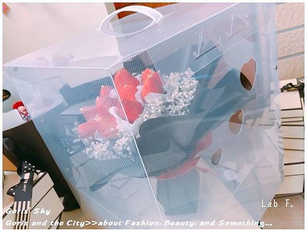 照片這是中束的,為了不讓花束傾倒,Lab F.倒是都有專屬的草莓花束提袋,可以擺放直立不會倒,同時兩側也有提袋可以提,中間就是草莓乾燥花束,像是被包圍起來的相當乾淨、可愛,同時優雅美觀。