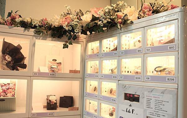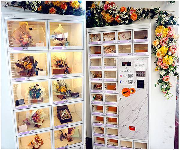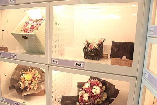 而這乾燥花販賣機就是24小時都自動營業,上面每一格的乾燥花禮,無論是禮盒、花束、飾品等都有標價,你輸入編號,投入指定的金額就能打開,最低從60元到上千元的乾燥花禮、花束都有。