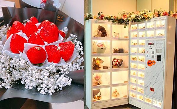 大概就是以上是目前韓國、日本都很流行、很夯的乾燥花販賣機以及草莓花束,同樣在台灣也都有,除了草莓花束都是採無現貨的客單訂製,然後在任何你想要贈送的日子做免運費的低溫宅配,同時妥善包裝贈送外,從收到的驚喜,無論是視覺、嗅覺、觸覺,甚至是最後還能吃下去的草莓,確實也是經過精挑細選的進口品質的好吃,幾近完美五感的最佳饗宴成為節慶花藝的一種全新選擇。