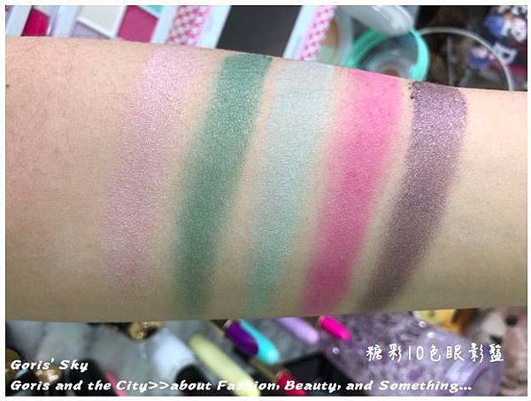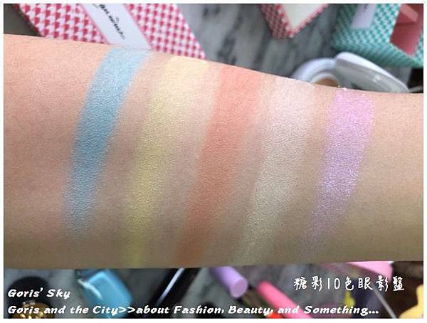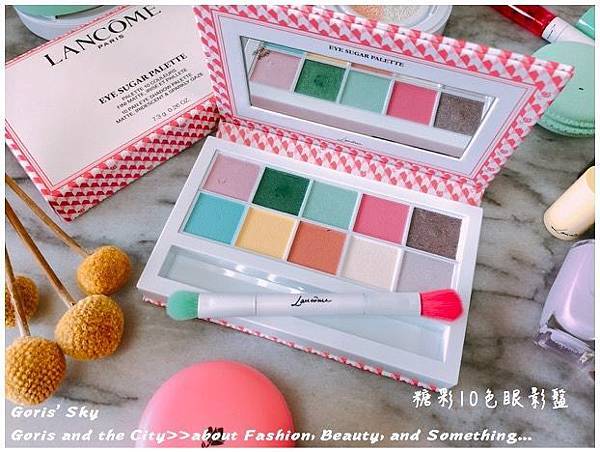 顏色共分5款虹彩色、2款閃耀珠光色、以及3色霧面,這次的LANCOME 糖彩10色眼影盤質地蠻特別的,眼影很軟,很像乳霜感,所以很好抓色,也很吃色,倒是因為這樣的質地改變,才能創造出如馬卡龍般輕盈,但又顯色的眼影色彩。