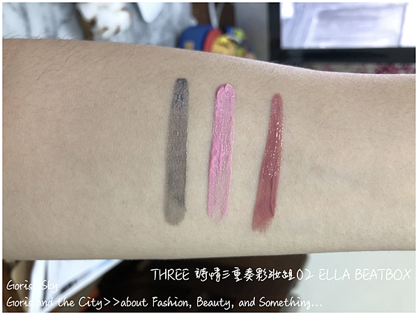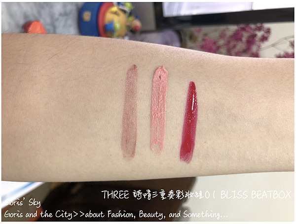 全試色如下,是由左至右依序是魅光眼彩蜜、魅光修容蜜和詩情霧光唇漾