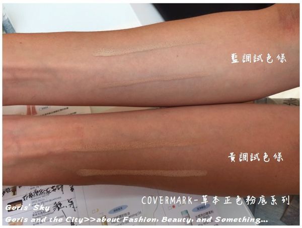 而這COVERMARK草本正色粉底液 SPF30/PA++共分14色,其之所以有名正是因為它有專門的選色方式,強烈建議不要亂買,一定要去專櫃用專屬的試色條試色,然後挑選適合的藍調或暖調的色號!這我之前提過,就是是COVERMARK的「Jusme color」草本正色理論,主要就是不知道你有沒有感覺,明明你膚色現在是這樣,但為什麼上了粉底,還是擦了什麼東西後,膚色會跑?主要就是皮膚下的血流影響,所以在選色COVERMARK-草本正色粉底系列時,專櫃就會這樣幫你做試色,看你上了試色條後,經過一點時間的變化,肌膚所呈現的樣子才是好看的,像我下方黃調的試色條所帶出的膚色就太紅,就代表我不是很適合黃色調的,反觀上方的藍調所帶出的膚色就比較白嫩,我就會比較適合COVERMARK-草本正色粉底系列的藍調粉底,這大概是COVERMARK-草本正色粉底系列很有趣的地方,同時能選到符合你膚色,同時自然的粉底顏色,因為真的一試,還真的差蠻多的。