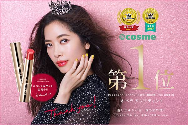 其中,OPERA渲漾水色唇膏Lip Tint 之所以著名、有名,這麼好的口碑外,除了產品真的本身好用外,就連在日本除了拿下相當具公信力的@COSME 不分專櫃、開架2017唇彩第一名外,更是拿下該年度全品類,也就跨類別,要同時當年度的腮紅、底妝,甚至是包括所有保養品之類一起票選的綜合大賞第一名!因為如果只是唇彩第一名,似乎也還好,但能夠跨品類拿下第一名,就真的相當威,等於就是如果你只能有一個美妝保養品,這OPERA渲漾水色唇膏Lip Tint 還擊敗洗面乳、精華液、粉底的成為票選第一名!(日本的@COSME跟台灣UeCosme非常不一樣,我這邊就不多說了)
