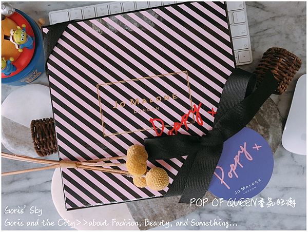 這一次的JO MALONE香氛狂潮QUEEN OF POP,有限定的彩條禮盒,緞帶同樣都是經典黑色的,但會繫上POPPY本人簽名的圓牌吊卡!圓牌吊卡共有藍色以及粉色兩款,而這包裝基本上JO MALONE傳統的正方形禮盒包裝,就是買兩樣商品以上就會有。