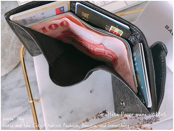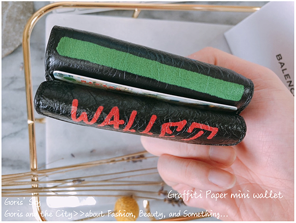 鈔票的部分,可說是完整能夠攤開平放,然後,後面三層夾層,就可以放各式的卡片,你可能以為一格只能放一張卡片~錯!你看,我平均一格少說能放兩張以上的卡片,你說是不是超能裝!這BALECIAGA Graffiti Paper mini wallet的設計,真的完全不輸給一般的對折式短夾,同時保證能放進小包包,加上其相當具巧思的使用方式、設計方式,莫名覺得也是怪時髦,帥帥的、潮潮的!