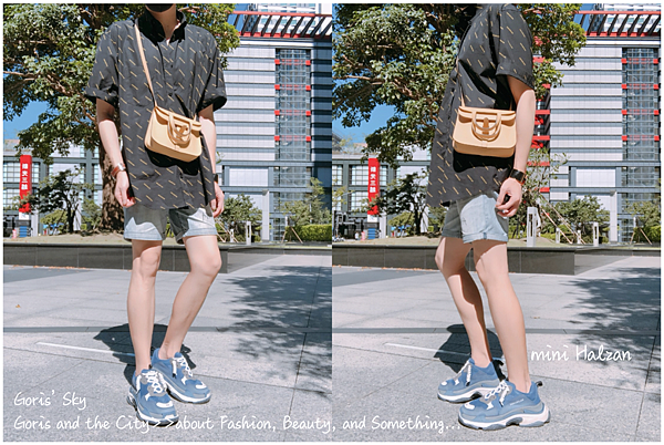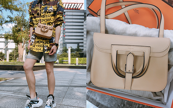 因為我自己現在包包能不手提,就不手提,能背就背,包包越輕越好,方便為主,真的買什麼東西,都丟車上就好,走路盡量輕便的概念,你看!我是覺得這樣的HERMES mini Halzan奶茶裸,很輕盈、很輕便,搭著我夏天這樣短褲、短袖,我覺得就好適合,很隨性、很自然,隨便揹都好看,整個人看起來很lifestyle,也不會太沈重,而且是一種率性的帥氣的俐落感,你看這樣的揹帶,長度也ok,無論你放前面、側邊、後面,只要是斜背都ok,很隨性自然,重點是我跟你說,真的揹過小包包後,你會有夠愛上小包包的輕盈、方便,隨性,我現在有時候都會迴響,我到底過去為什麼要那麼自虐的好像在舉重般的一直都在買最大的包包,又重、又貴,逛街提著也真的有夠負擔!但也必須說啦,揹小包包能裝的東西也很有限,是很需要斷捨離的讓一些平常沒在用的東西不要帶在身上。