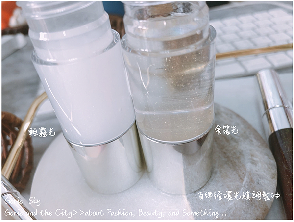 你近看會更明顯!自律循環光膜調製油(輕霧光)是比較霧化、凝露般的白色色彩,但相對的,自律循環光膜調製油(金箔光)則是看得到那一絲一點的金箔光芒,而其主要成份為含大小不同珠光粉末的雙重金黃珠光粉末,一抹就會自然溶解,但同時能帶出肌膚亮度,直接看質地測試、比較會更是明顯。
