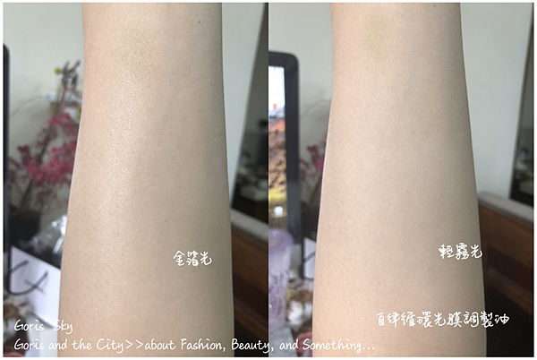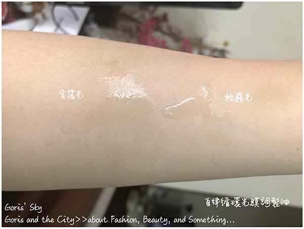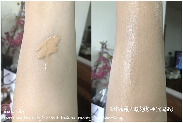 這張照片比對事我都單用而已,就是直接取部分的自律循環光膜調製油,無論是金箔光或是輕霧光,於肌膚上化開,你會發現相當明顯的是左邊的自律循環光膜調製油(金箔光)的潤感、光澤感相當明顯,肌膚都透亮起來了!右邊的自律循環光膜調製油(輕霧光),就有點整肌、柔焦,同時讓整個肌膚看起來比較平滑、平整、微霧了起來。
