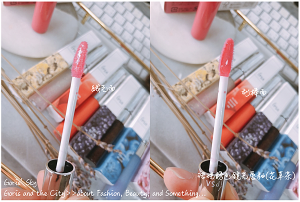 看試色前,這活現誘色鏡光唇釉-花果茶限定版的刷頭倒是蠻特別,我們通常一個刷頭就可能都是絨毛面,又或者都是刮棒面,在意的是其角度,以及面積大小等,而活現誘色鏡光唇釉-花果茶限定版的刮棒,反倒是一次結合了刮棒面、絨毛面的兩種刷頭,先以平滑的刮棒面完整的將唇釉一滴不留的均勻覆蓋在雙唇上後,再以絨毛面均勻塗抹,不僅能夠完整平滑雙唇的紋路外,同時也能完整緊密結合雙唇,實現宛如釉彩定型般的豊澤光潤唇感。