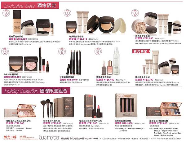 目前laura mercier全台共14個專櫃(含臨時櫃),包括台中大遠百、中友百貨、台南南紡購物中心、板橋大遠百(臨時櫃)、漢神巨蛋、統一時代高雄店、新光三越台北站前店、新光三越信義A8店、新光三越台北南西店、新光三越桃園大有店、新光三越高雄三多店、遠東百貨寶慶店、台北忠孝SOGO、SOGO新竹巨城店,各百貨最後一次超值的周年慶獨家特惠、組合、DM整理如下: