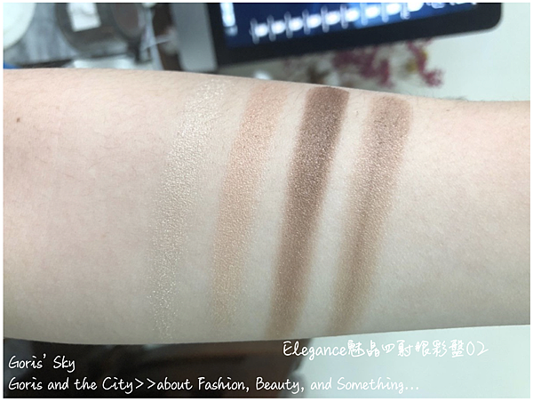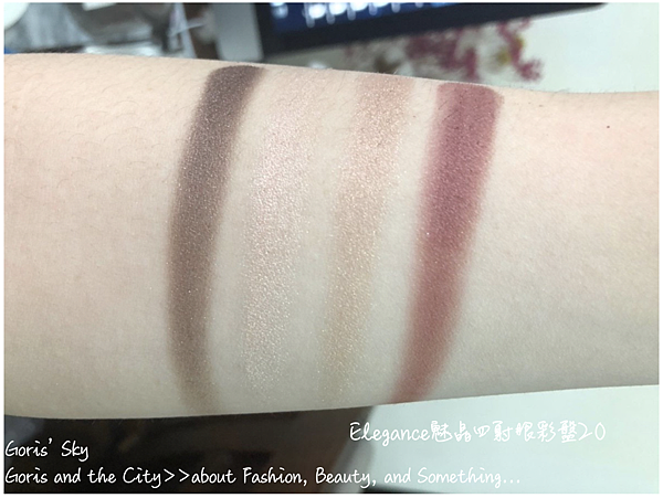 而我自己在接觸過許多眼影,Elegance的眼影走的也不是很強烈、很顯色、很狂,就真的如品牌名:優雅、細緻,同時不太飛粉,顏色很凝聚這樣,直接看試色比較明顯。