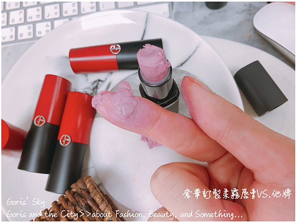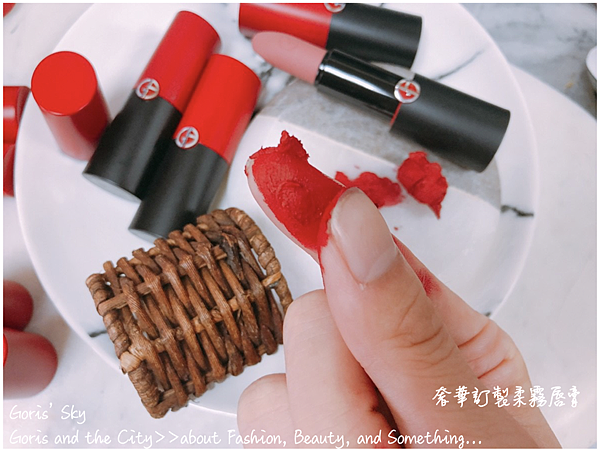 但我可能把它想的太簡單,想說就是把唇膏取出、拿起來再放到收納盒就好,但才發現搞得我整個手都是!我試圖要擦掉的同時,還越搞越糟,就當我的手這樣反覆戳揉,我才一整個意外...咦,這質地真的很特別耶,因為本來試色我就是試在手臂內側上,真的不會有太大感覺,因為我在家試色,我也會挑一兩支擦在嘴唇上,看看感覺然後再卸掉,比較好體驗使用起來的感受,也比較好寫,一開始只覺得就真的很柔滑,柔霧的同時,求修飾唇紋的效果蠻好的,還不是很懂這GIORGIO ARMANI奢華訂製柔霧唇膏所強調的乳霜感是什麼概念?