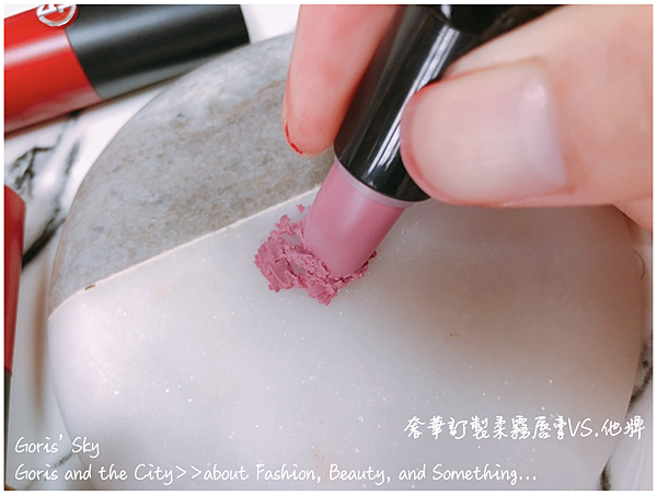 我找了他牌的另外一支唇膏來比較,這唇膏我真的沒有用斷的意思,只是想說GIORGIO ARMANI奢華訂製柔霧唇膏都被我弄斷了,既然要講,乾脆就找一個來做比較,才會比較明顯,結果不知不覺...,瞬間斷了兩支唇膏。