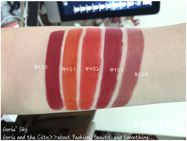#401:朝氣般的活力橘色,這種橘色如果放在一般光澤唇膏就會過於搶眼、突兀,倒是在收了光澤後,轉換成柔霧感,反而多了些溫柔。
