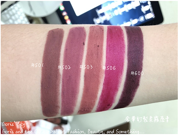 #506:這顏色比較特別,也不好拍,可能是因為這次的柔霧唇彩關係,唇膏看到的顏色跟擦起來的顏色略有落差,特別是唇膏本身是完全無法反射光線的質地,看起來會特別飽和、暗,不過一試色倒是很讓人眼睛為之一亮,很清麗明亮的柔霧葡萄紫。