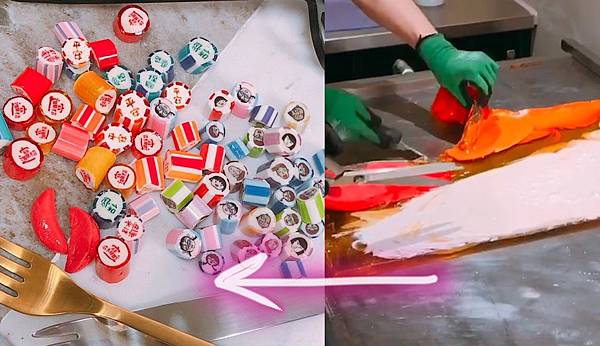 你去看,會在一個鐵板上,倒入應該類似麥芽糖的概念吧?然後再放上各種調味料,開始會有彩色感。
