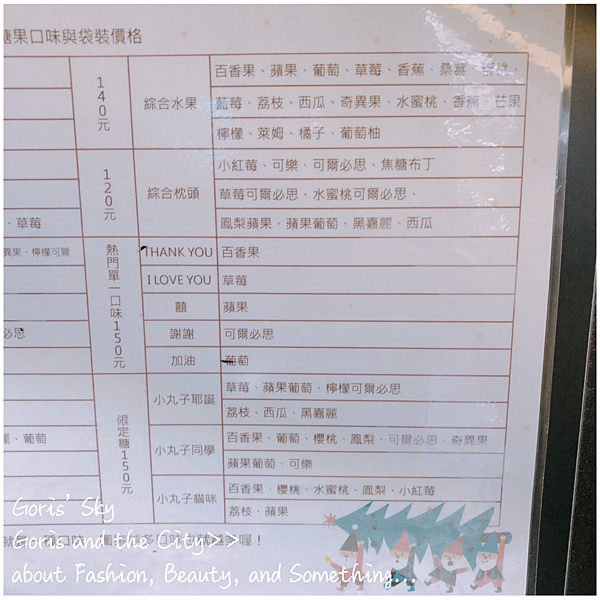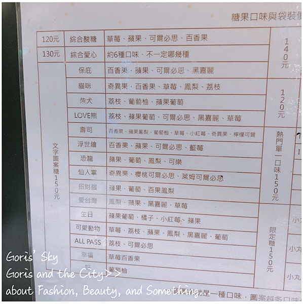 以上是我當天拍到現場有的款式,他們還有很多款式,你可以直接看menu,而所謂的客製化是他們真的可以客訂,就是你可以跟他們討論要做什麼圖案,寫什麼字,怎麼組合,我不太知道一個訂單要多久?但價目是總共5kg的糖果,收費10000元,不要以為好像很少喔,這個袋裝大概只有60g,5kg的話,5000/60=83,約可以做80包左右,聽說很多人結婚會來訂做喜糖,客製化寫名字之類,我覺得好有創意喔!學起來~