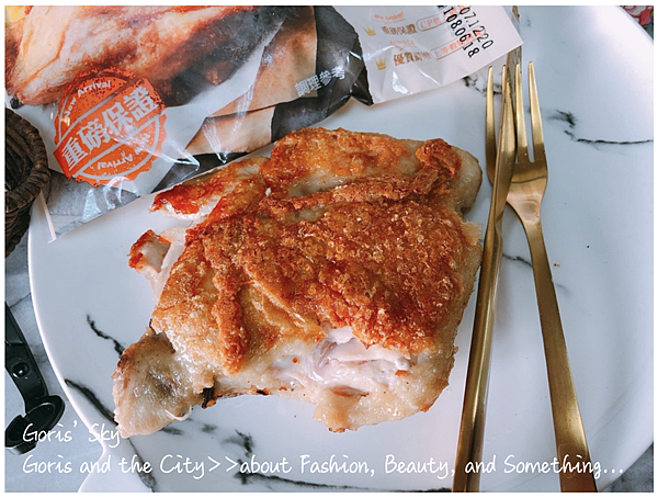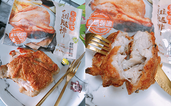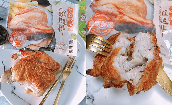 你會看見,整個外皮看起來就更金黃的感覺,有一點宛如在吃炸雞了對吧?但也不知道是不是加油煎的關係,所以雞腿排看起來就略小一點,因為我記得我拿出來都差不多大說,但好吃最重要,這樣39元還是很便宜了。
