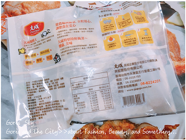 背面是相關產品說明,很難近拍到讓你們全看清楚,我主要是要說,這邊有教烹調方式,基本上這大成黃金脆皮雞腿排都是要冷凍保存,期限都有8個月左右,所以不用太擔心,料理時,分兩種,都是在解凍後,直接放入油鍋炸,或者是煎,隨你~我基本上自己在家裡不用油鍋炸東西,畢竟我不是要炸很多東西,自己為了吃一個雞腿排,就要用一鍋油,我覺得實在太浪費油了,所以我都煎為主。