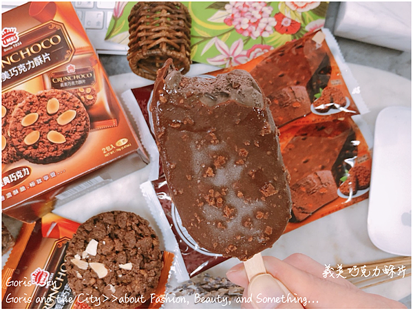 咬下去!誒誒,不是曠世奇派啦,哈哈,裡面不是那種香草、牛奶,還是醇黑巧克力那種,然後搭配外層巧克力脆片,還有表面上那些巧克力酥,但我本來以為,內餡的巧克力冰淇淋中還會有些餅乾或是巧克力酥片?但其實就是純巧克力、醇巧克力內餡這樣,裡面就是很單純的巧克力冰淇淋這樣,但完全不會太甜膩,或是有廉價的口感,就好像巧克力酥片,一種很平民般的奢華好吃,然後整個雪糕外層裹著巧克力片,同時還有那宛如巧克力酥片的巧酥,整個一起吃,還真很能移情成我就是在吃經典的巧克力酥片的冰棒感啊!