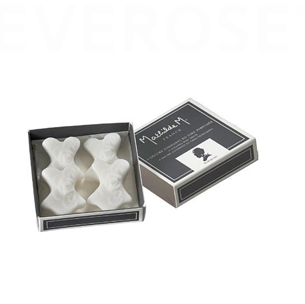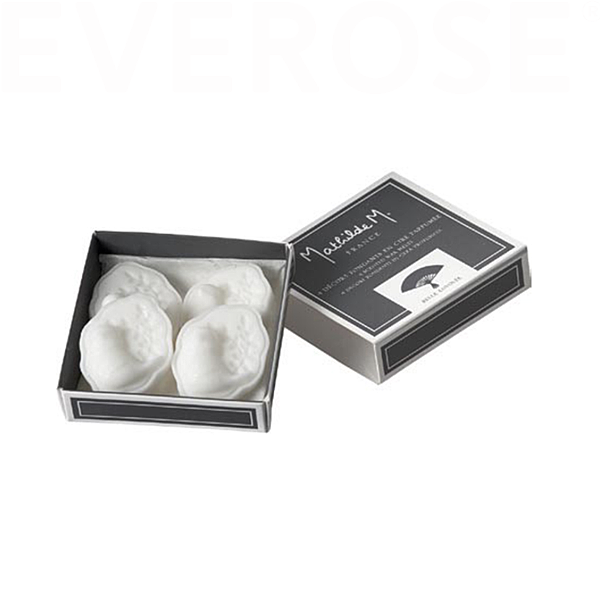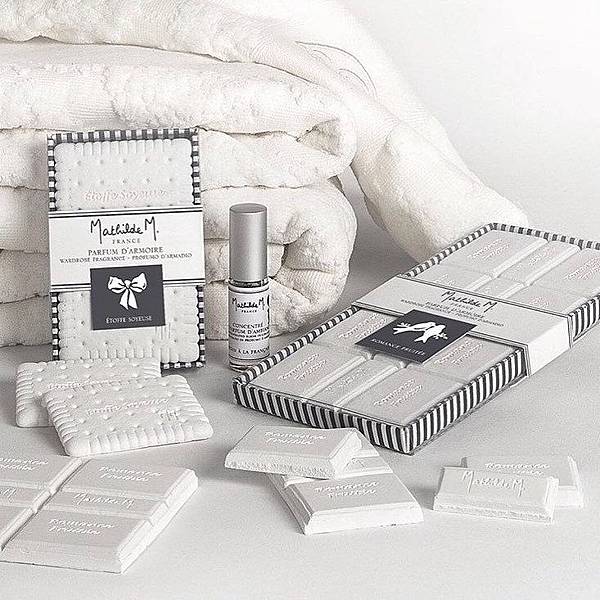 其中,Mathilde M. 的所有香氛商品,皆是於南法以純手工製作,產品包括蠟燭、擴香、沐浴乳、護手霜、香水、洗手乳、室內芳香噴霧、衣物噴霧、香氛皂、各式保養品等...產品非常多樣,也非常親民,像是其中最著名的"雪白芳香石", 是先將特殊比例調製的石膏灌進模具塑形, 待固定脫模之後, 再以手工雕刻紋樣花飾, 最後, 浸泡在特別調製的香精當中淬煉而成的香氛石餅乾,這可以用來放在抽屜、衣櫥、甚至是車上作為擴香使用,搭配一瓶5ml的Mathilde M. 的香精濃縮液,就能一直使用同時居家香氣,並且裝飾使用。
