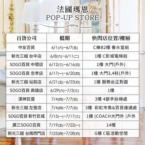 關於這法國 Mathilde M.除了現有專櫃都買得到外,目前也有全台巡迴快閃活動 完整檔期如下: