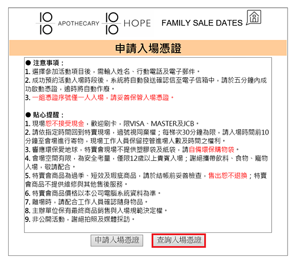 2.請依指定時間回特賣現場,10分鐘過號視同棄權,每梯次30分鐘為限,入場時需寄物,現場工作人員保留控管進場人數及時間之權利。