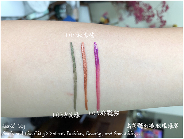 年初限定春妝才推出的晶采豔色液狀眼線筆,在這一次限定秋妝又追加全新限定3色,用以搭配這一次多樣化的色彩眼妝,從有神不失優雅的103卡其綠、秋天韻味明亮光澤的104秋意橘、玩心搶眼的105鮮豔粉,3款全新限定色彩,這次眼線筆都是限量,因為秋冬的眼妝較重/帶灰調,所以眼線的顏色比較亮,去跟眼盤做搭配。