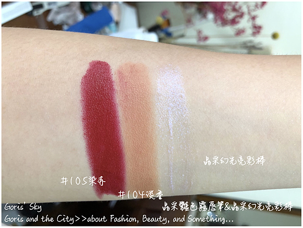 之前也在英國限定彩妝中出現的晶采豔色霧唇筆,這次又加加新兩色,其自動轉出的設計,不需要削就可以使用,胖胖剛好的唇彩筆,直接塗抹在雙唇很剛好,經典百搭的霧紅色#105染赤,然後氣質輕裸的#104淡香,彩度呈現的很飽滿,同時潤澤、修飾,簡單易用。