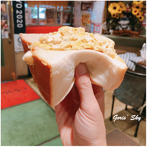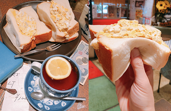 而這雞蛋沙拉極厚三明治吃起來,其新鮮的雞蛋沙拉這都沒什麼問題,相當ok,也很有種鮮甜感,我覺得吐司最厲害吧,吐司是那種超柔軟、超級綿密口感的吐司,口感上可以說非常細緻,真的是很好吃,完全兼顧大碗、大份、同時又料好實在,一份才600日圓,完全是日本自助旅行者的雨後甘霖。