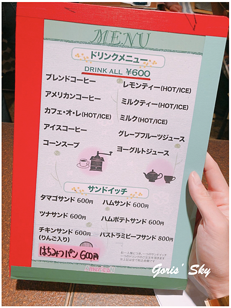 然後這是菜單的部分,基本上上面就是飲品,下面是三明治、沙拉之類,主要有像是雞蛋沙拉吐司、蘋果雞肉沙拉吐司、鮪魚沙拉吐司、燻牛肉吐司、冰奶茶、咖啡、檸檬茶、美式等....其實我去翻以前的一些網友分享的文章,當時才500日圓,現在漲到600日圓了,但我還是覺得很ok,是便宜的,特別是對我們這種自助旅行的人來說,完全是一種有夠暖心的價格啊。但你以為價錢便宜,份量就少?就隨便嗎?完全不是,你等等看到照片真的會瞠目結舌!!!!!!!!!!!