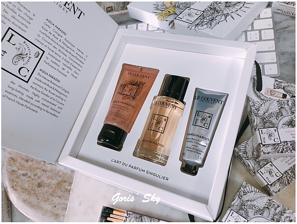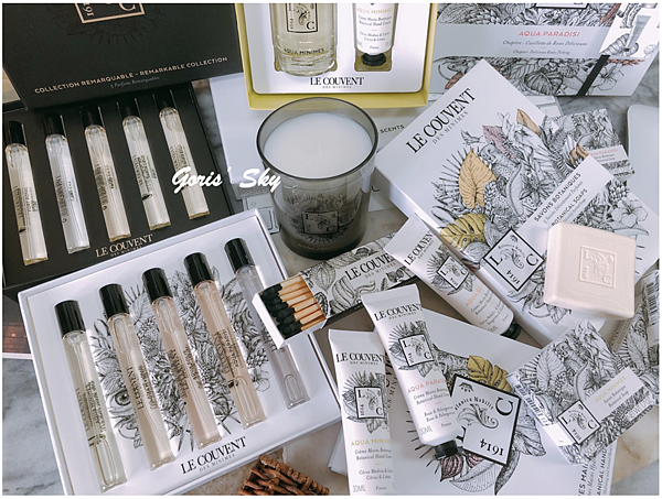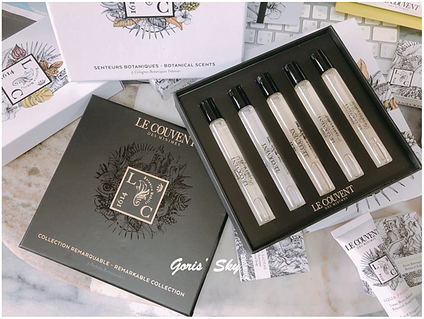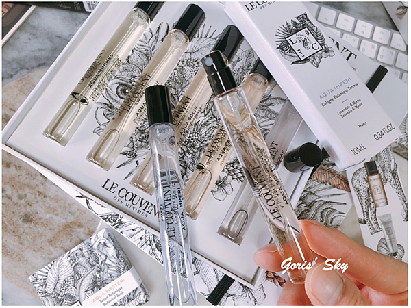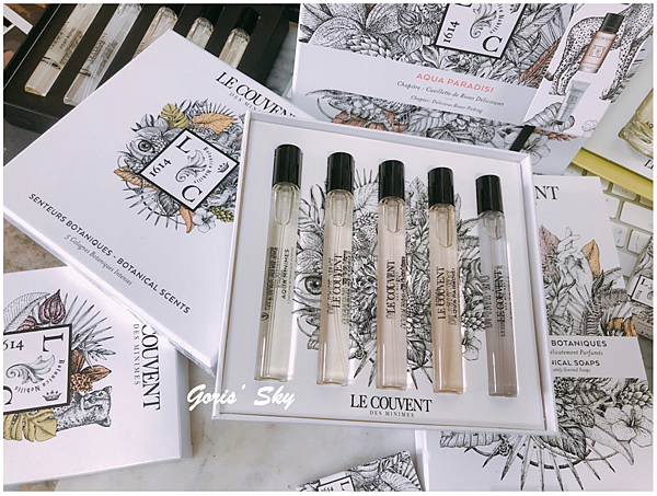 雖然說不能選味道,就是禮盒都固定好的香味,內含仙境之水、米尼姆之水、陽光之水、謎漾之水、聖潔之水淡香水隨身瓶10ml,但該有的都有了,而且Le Couvent des Minimes洛蔻芳的香氛一大特色就是都蠻好穿的、蠻好搭的,你可以單噴、疊擦其實都可以,味道都很平易近人,也各有各的特色。