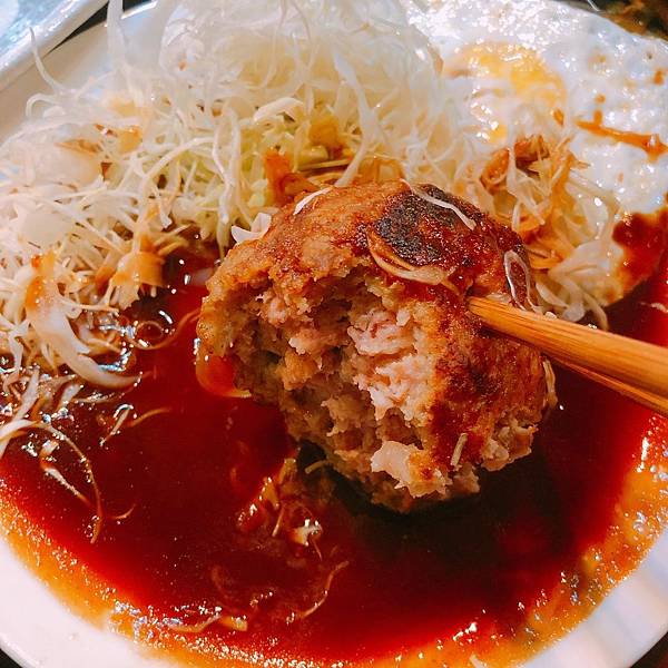 別著急,漢堡排就壓在煎蛋下面,有別一般漢堡排大多是厚片狀、這裏名古屋台所的漢堡排則是球型很是可愛。