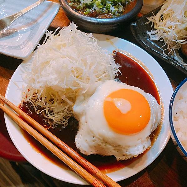 招牌必點的主食「煎蛋手作漢堡肉」,主要就是生菜,搭配一大顆煎蛋太陽蛋,以及一碗白飯,是不是單看視覺就有夠吸引人!