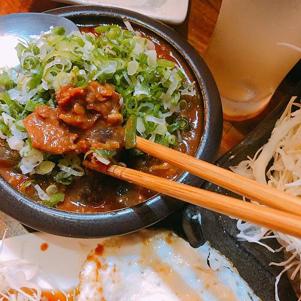 建議吃的時候,就是這樣夾起來,一起夾到些青蔥一起吃才不會過鹹或太膩,某種程度來說,倒在白飯上就很是紅味噌丼飯了,但真的是有些鹹就是,但我真的很愛名古屋台所的紅味噌,就是在吃一種味噌料理,很有一種日本的家常感,覺得喜歡。