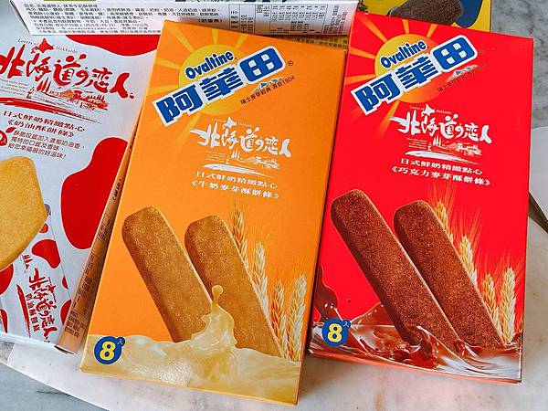 而我這次主要重點還是北海道戀人x阿華田-牛奶麥芽酥餅條 或是北海道戀人x阿華田-巧克力麥芽酥餅條這兩款。一包定價59元,買一送一差不多一包30元而已,一盒有8入,每一包都還有獨立的包裝,不用擔心一拆盒就要梭哈的全吃完。