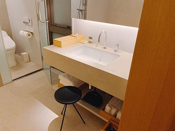 單是盥洗台的部分,就相當洗鍊質感,以及大理石的設計,搭配原木的各種收納,也相當呼應整間房間的風格。
