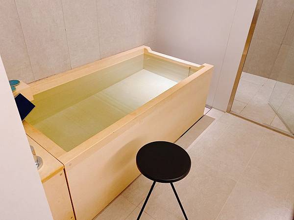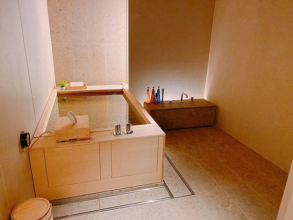 湯屋的設計浴缸又一整個更勝房間檜木浴缸的設計,你真的會賴在這不想走啊....,當晚我們泡的湯是薑湯,配合外面天氣的濕涼,一整個可以說是相當暖身又暖心,特別是薑香伴隨檜木的香氣,真的有夠療癒。