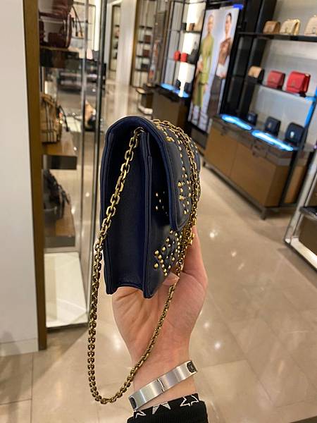 仔細看,又是個相當美麗的午夜蘭深藍色,而且對比復古金色的鉚釘菱格紋,然後到正中央也相當醒目的DIOR LOGO,再加上整個扣的復古仿舊設計,對比在深藍色的皮革下,質感顯像也真的有夠好,背帶鏈子也是可長可短的設計,襯著復古金色,對比出一種相當美麗的視覺感,有夠好看,重點是真的有夠便宜!