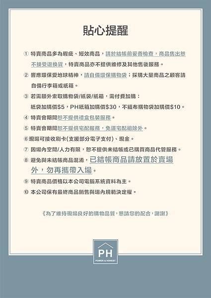 1. 特賣商品多為瑕疵、短效商品,請於結帳前妥善檢查,商品售出恕不接受退換貨,特賣商品亦不提供維修及其他售後服務。