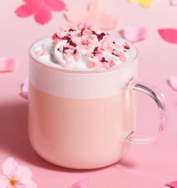 如果不想要喝冰的,也有熱的櫻花拿鐵,完全無咖啡因,僅有櫻花草莓醬和熱牛奶的融合,同時奶泡上面撒有宛如櫻花落下的花瓣,Short 450円、Tall 490円、Grande 530円、Venti 570円、2月15日~3月12日限定販售。