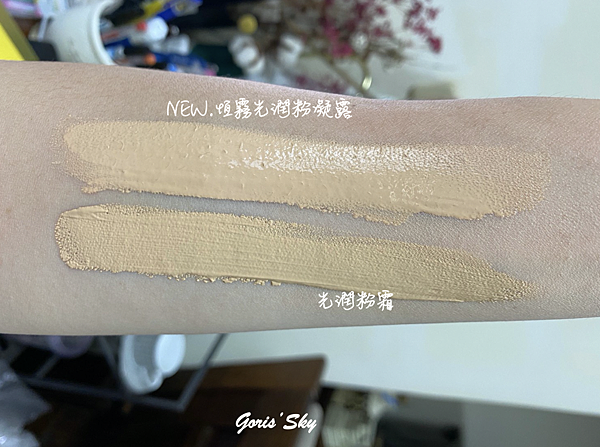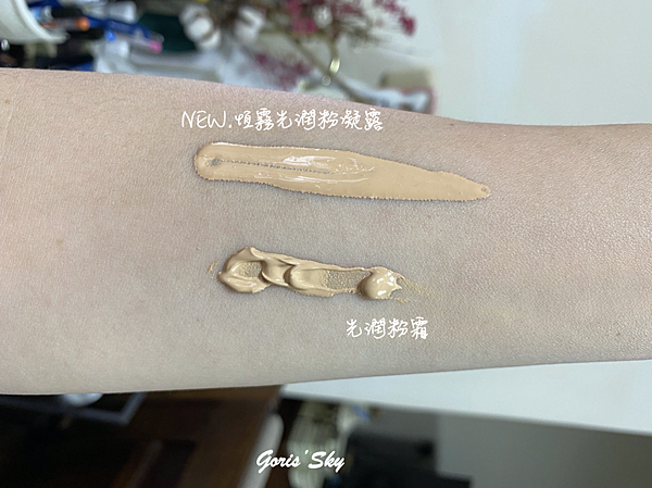 是不是!單是在擠出來的質地,新款恆霧光潤粉凝露、舊款光潤粉霜就完全不同!你都能感受到舊款的光潤粉霜還是比較"ㄍㄡˊ",然後比較粉霜感,新款的恆霧光潤粉凝露質地就比較輕盈水潤一點,視覺上單是水感、水潤感、光潤感就都比較強,同時更顯得細緻。