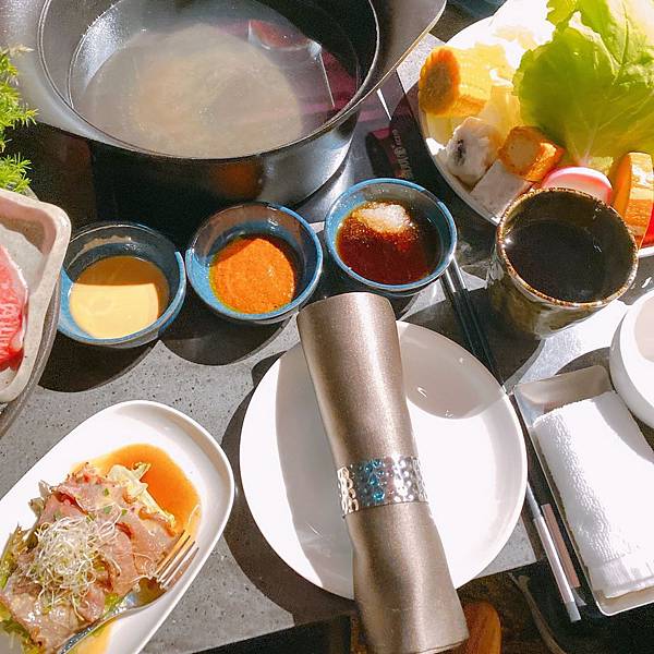 無論是餐巾、餐巾環、餐具、甚至是一些杯碗器皿質感都很好,醬料分胡麻醬、沙茶、爽口的蘿蔔泥應該是日式醬油醬我沒記錯的話。